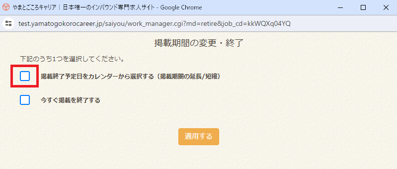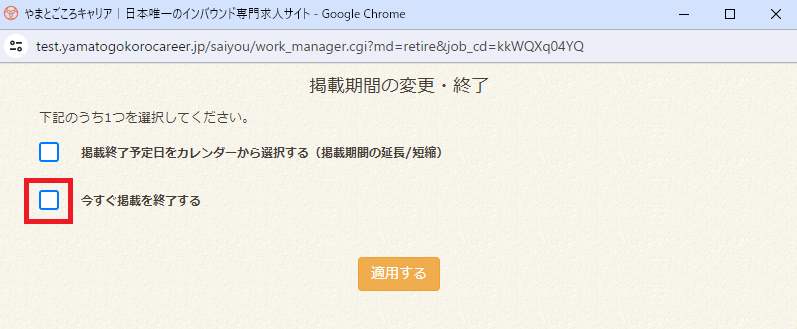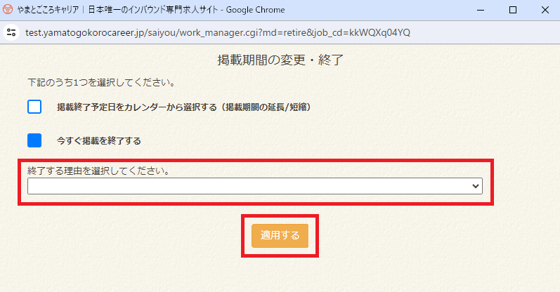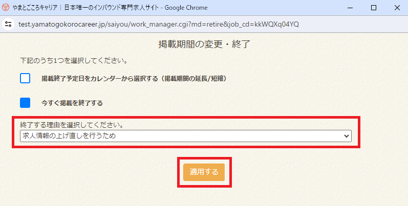⑤ 終了する理由は「求人情報の上げ直しを行うため」を選択いただき、「適用する」ボタンをクリックしてください。
