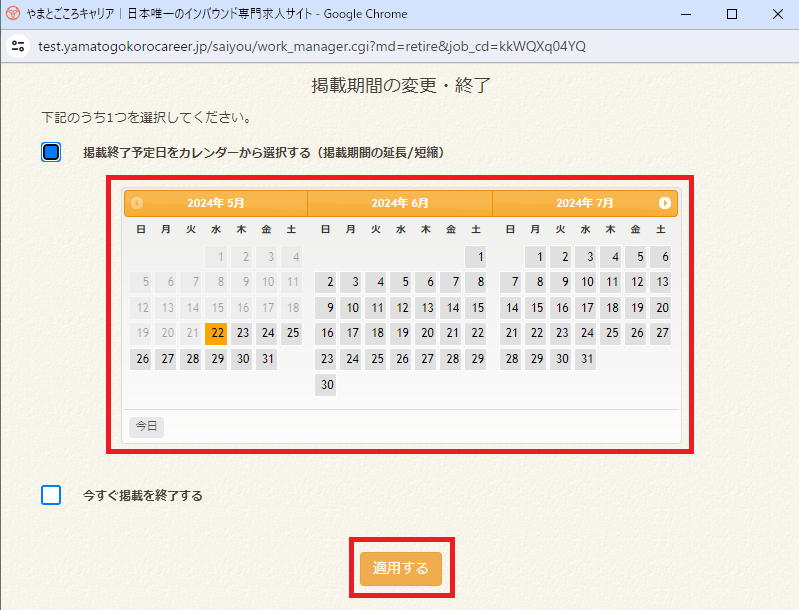 ③ 表示されたカレンダーより掲載終了予定日を選択後、「適用する」ボタンをクリックしてください。