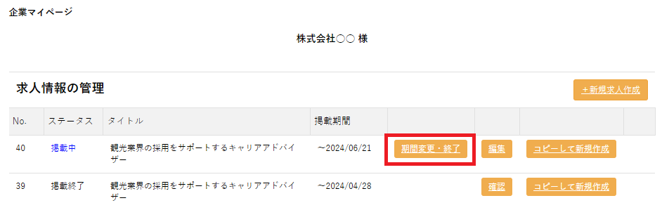 ①「掲載中」のステータスの求人は「期間変更・終了」ボタンより、お好きなタイミングで掲載終了をすることが可能です。