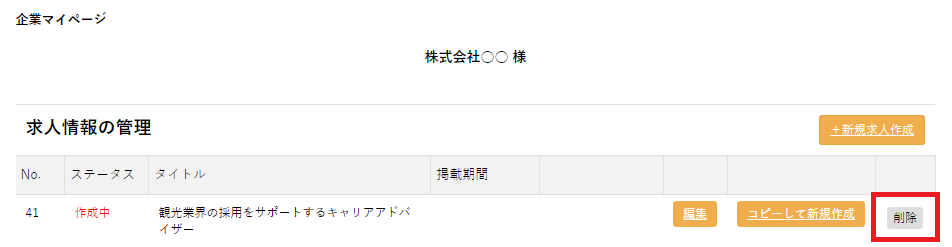 ③ 「作成中」「掲載依頼中」のステータスの求人は、「削除」ボタンをクリックし削除することができます。誤って重複登録してしまった場合などにご利用ください。