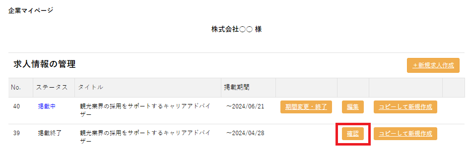 ② 掲載終了した求人は編集することはできませんが、「確認」ボタンより内容を確認することは可能です。