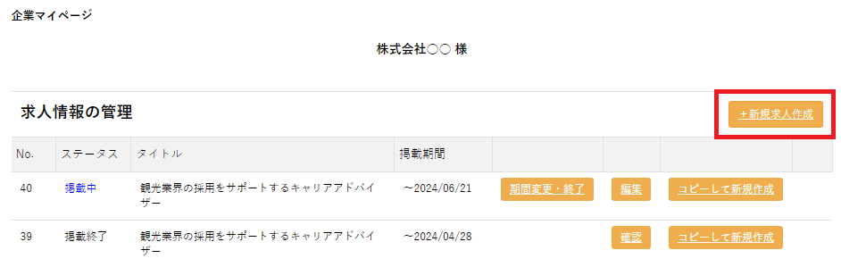 ① 画面右上の「+新規求人作成」ボタンをクリックします。