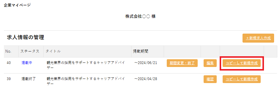 ① 掲載中の該当する求人の右にある「コピーして新規作成」ボタンをクリックします。
