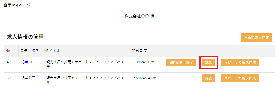 ①「作成中」「掲載依頼中」「掲載中」のステータスの求人は、お好きなタイミングで求人内容を編集することが可能です。該当求人の「編集」ボタンをクリックして編集を行います。
