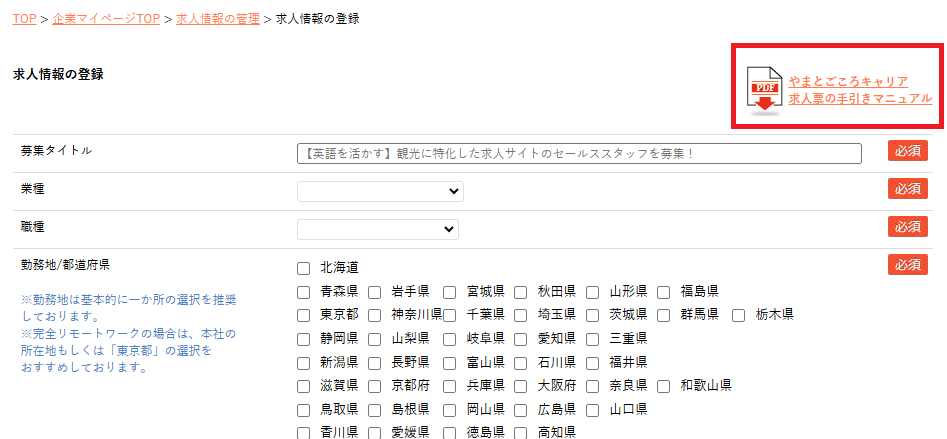② 画面右上の求人票の手引きマニュアルを参考にしながら、各項目をご入力ください。