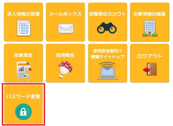 企業マイページトップの「パスワード変更」をクリックするとパスワードを変更することができます。なお、ID変更については、企業情報の編集より変更をお願いいたします。