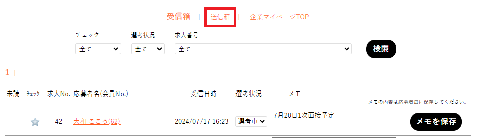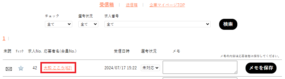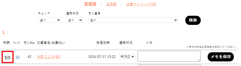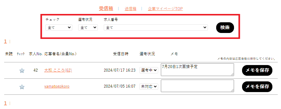 メールボックス上部のプルダウンより、「チェック」「選考状況」「求人番号」ごとに応募者を検索することが可能です。複数の求人を出されていて、どの求人からの応募かが分かりづらい場合などは、こちらの機能をご活用ください。