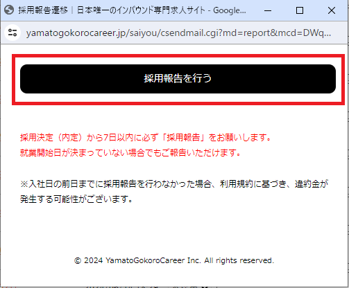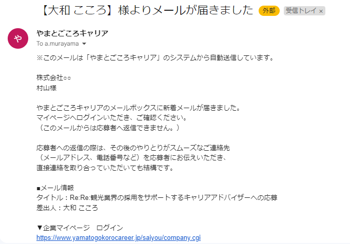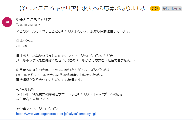 ① 応募が入った場合「【やまとごころキャリア】求人への応募がありました」というメールがご登録のメールアドレス宛てに届きます。
