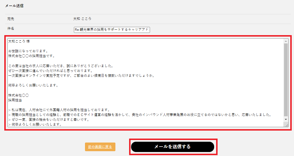 ② メールの作成画面が表示されます。メールの内容を入力し「メールを送信する」ボタンをクリックするとメールが応募者に送付されます。