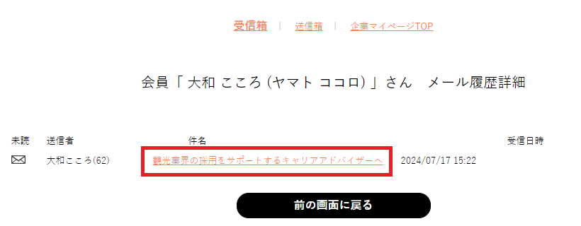 ④ 応募者から返信があった場合「【応募者名】様よりメールが届きました」というメールがご登録のメールアドレス宛てに届きますので、企業マイページにログインし、応募者からのメールをご確認ください。