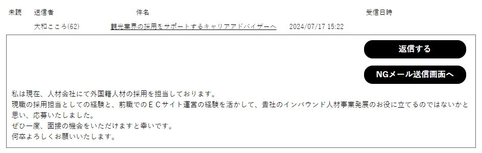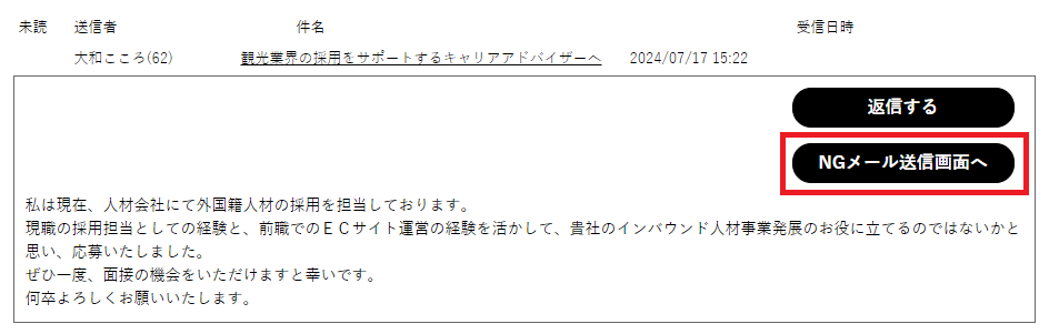 ※NGメールはテンプレートの文面となりますので、ご希望の文面で返信したい場合はメール作成画面よりご対応ください。