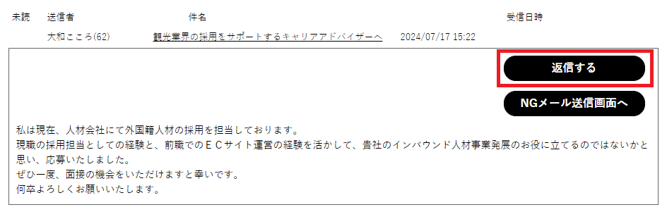 ① 応募者に確認事項がある場合や選考結果の連絡をする場合は、メールボックスから応募者とメールのやり取りが可能です。返信をしたいメールの件名をクリックした後、画面右側の「返信する」ボタンをクリックします。