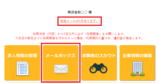 ② 企業マイページにログインし「新着メールが○件あります」もしくは「メールボックス」をクリックし、応募を確認します。