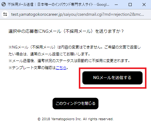 ② ポップアップ画面が表示され「NGメールを送信する」ボタンを押すと、NGメールが送信されます。
