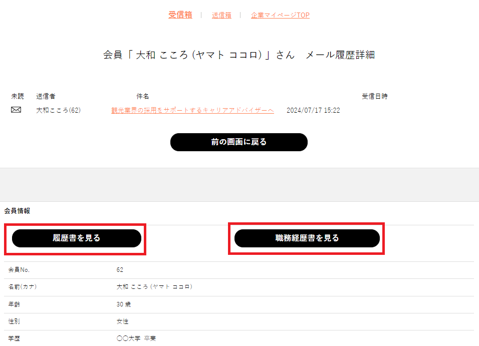 ※応募者が応募書類をアップロードしていない場合は「履歴書を見る」「職務経歴書を見る」ボタンは表示されません。アップロードされていない場合は、応募者にアップロードを依頼してください。