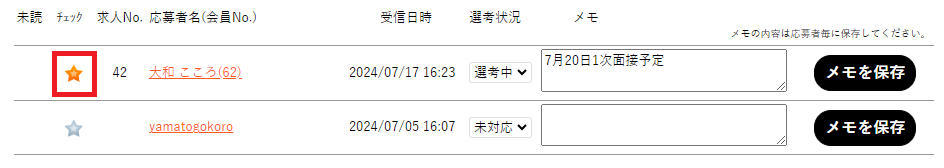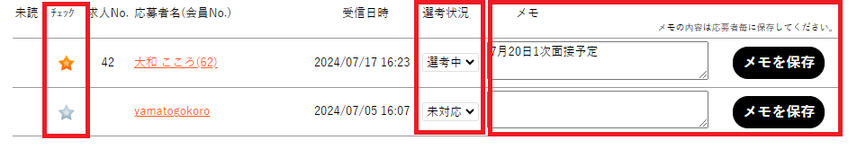 メールボックスでは選考状況の管理をすることが可能です。「チェック」「選考状況」「メモ」をご活用ください。