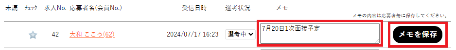 メモには自由にコメントを残すことが可能です。メモにコメントを入力をした後、右側の「メモを保存」ボタンをクリックすることでメモが保存されます。採用担当者間での情報共有などにご活用ください。