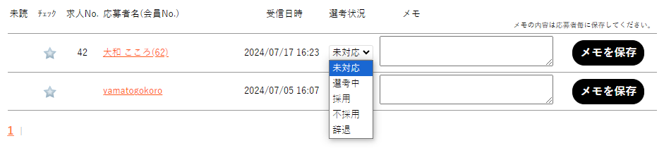 プルダウンで選考状況のステータスを管理できます。デフォルトは「未対応」となっており、「選考中」「採用」「不採用」「辞退」のステータスに変更が可能です。
