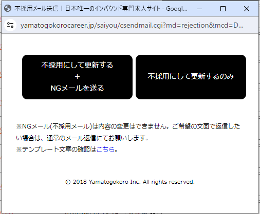 ※「不採用にして更新する+NGメールを送る」ボタンをクリックすると、すぐにNGメールが送信されますのでご注意ください。